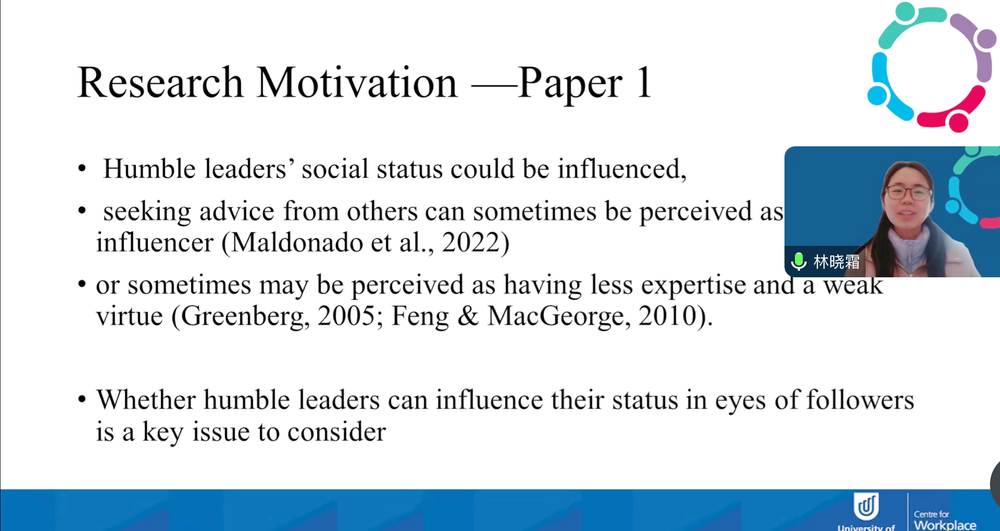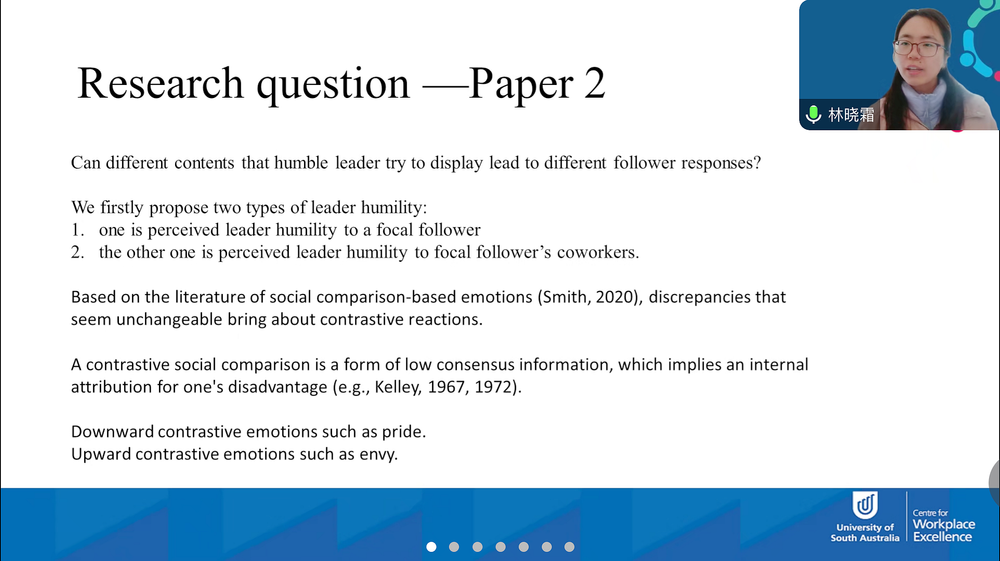 5月24日,永利yl23411俊秀青年学术俱乐部、耀翔讲堂系列讲座顺利进行。公司邀请南澳大利亚大学商公司林晓霜副教授在线作了题为“谦卑型领导研究最新进展”的学术报告,公司青年教师、研究生和本科生在线参加报告。报告会由段锦云教授主持。