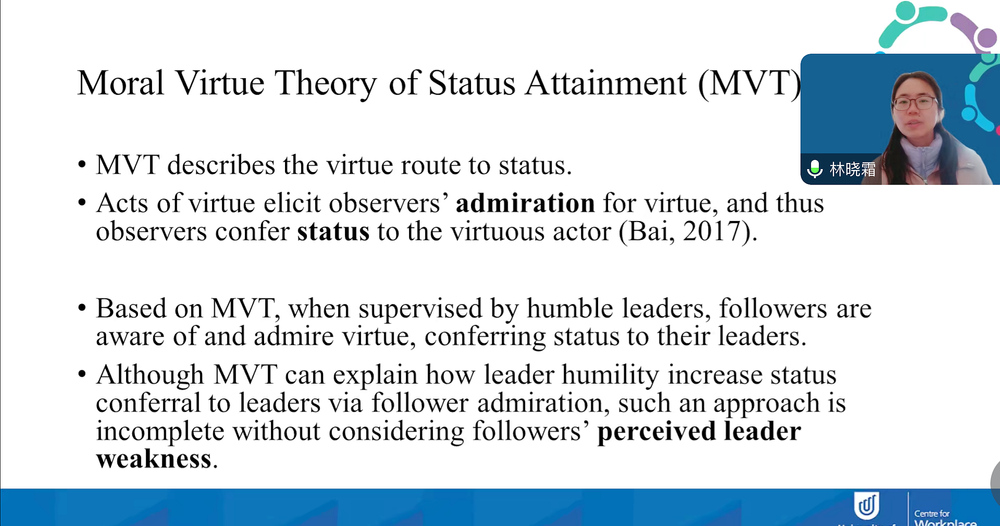 林晓霜副教授在报告中,介绍了两篇准备发表的谦卑型领导相关文章。第一项研究基于地位获得理论,探索领导地位是如何受到其谦卑谦逊的影响的。结果表明,道德感强的员工更加钦佩谦卑型领导,并进而赋予领导更高的地位。