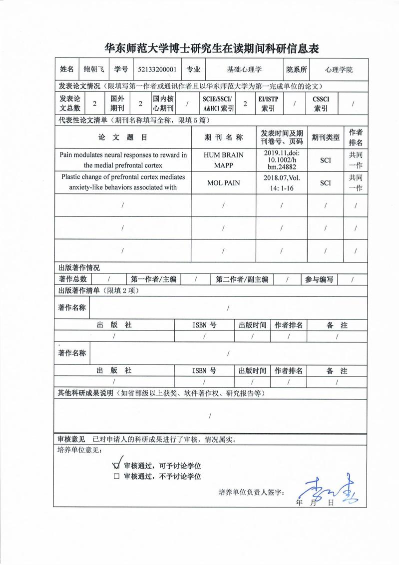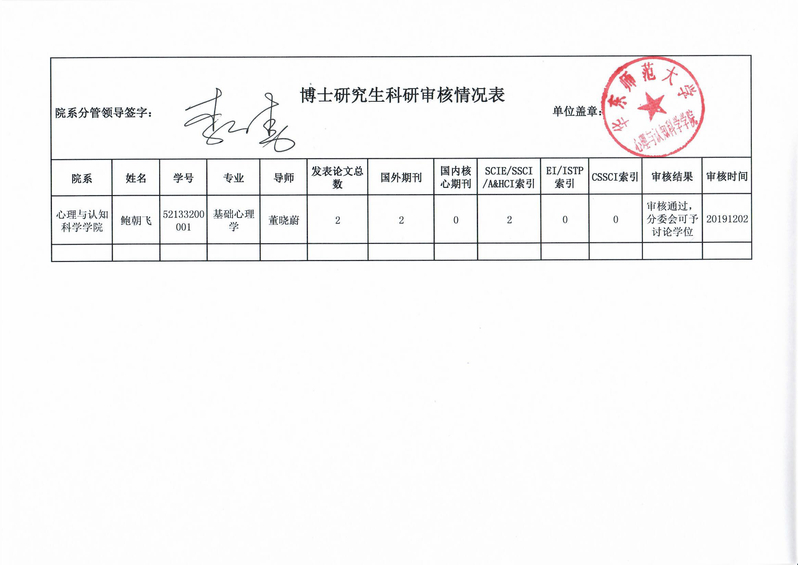 根据《永利yl23411关于2019-2020学年第一学期博士研究生科研成果审核的通知》,现将鲍朝飞博士研究生科研成果信息予以公示,公示时间为12月2日至12月6日。公示期间如有异议,请向研究生教学办公室郭老师进行反映,联系电话:62233433,办公地点:俊秀楼202室。 心理公司研究生教学办公室2019年12月2日公示文件:
