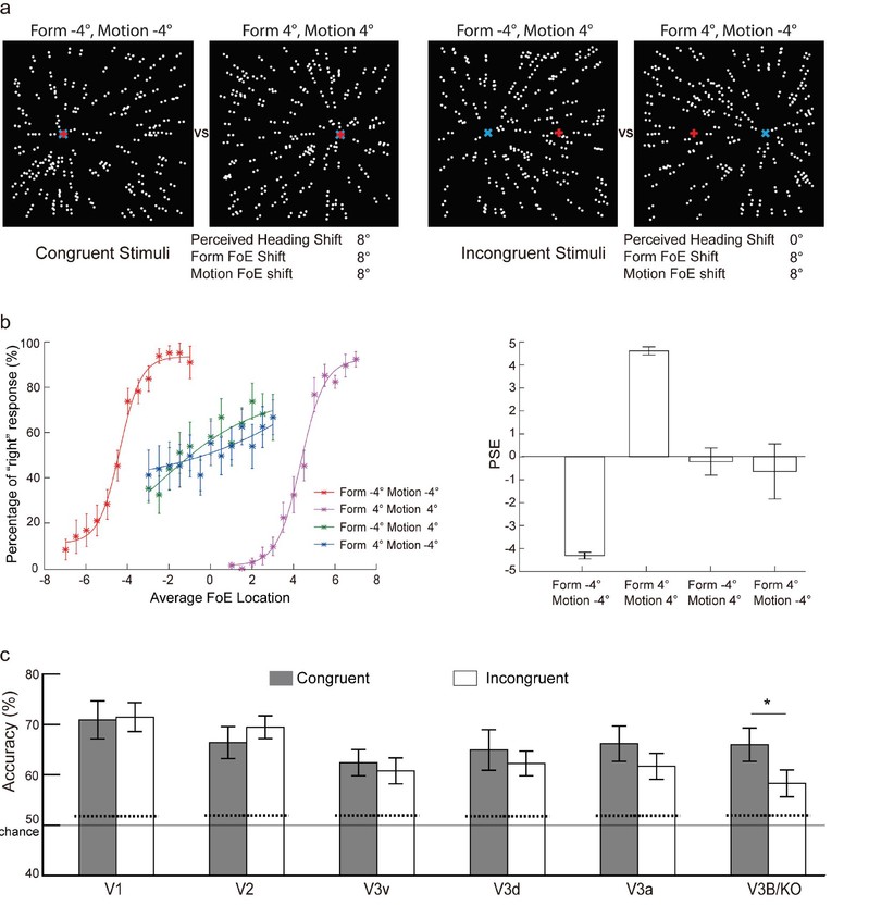 那么在这些脑区中哪些可以完成形状和运动信息的整合呢?研究者进一步比较了在形状和运动发散中心一致或者不一致的情况下,不同脑区反应的差别。结果表明,脑区V3B/KO对于一致组的条件比不一致组的条件区分得更好,说明该区域负责整合形状和运动发散中心以形成整体的对自身运动的判别。