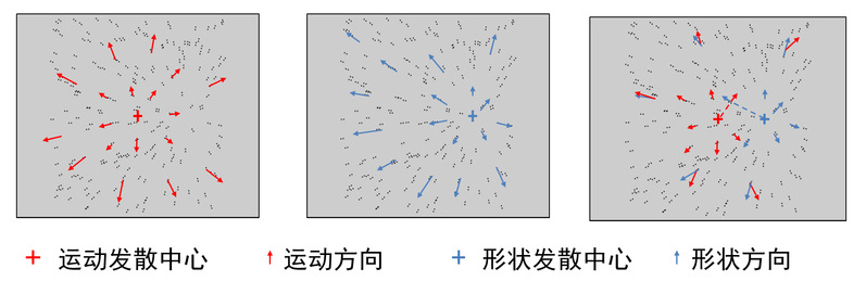 该研究使用成对散点的整体发散运动模拟人向前移动的过程,在移动过程中,点通过放射性运动形成运动发散中心(红色十字),每一对点连线的朝向形成形状发散中心(蓝色中心)。研究首先分析了大脑对不同位置形状发散中心的反应,发现初级视皮层(V1 和V2)和高级视皮层(V3v, V3d, V3a和V3B/KO)对形状发散中心的进行了编码。