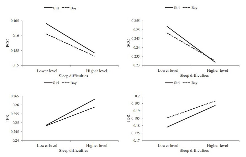 3)出现较多睡眠困难的女孩(比男孩)和年纪较小的青少年(比较年长青少年)更容易出现适应不良的压力反应,即更少的初级(PCC)和次级控制亲近应对(SCC),更多的不随意亲近反应(IER)和不随意逃避反应(IDR)(图3和图4)。