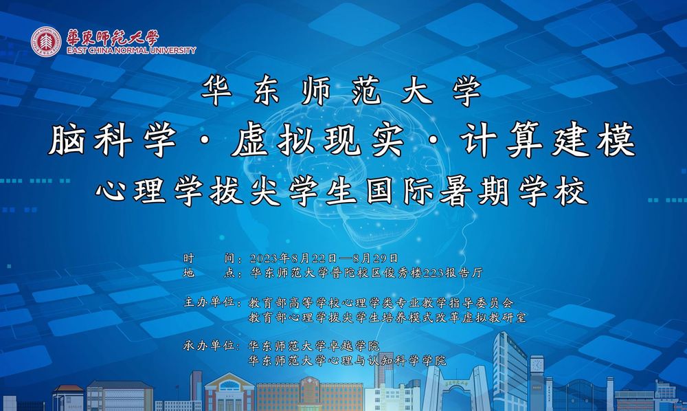 为深入贯彻落实《教育部等六部门关于实施基础学科拔尖员工培养计划2.0的意见》的要求,加快建设高质量的国际化培养体系,推动拔尖员工国际合作、学术交流向实质性、更高层次迈进,切实提升人才自主培养质量。由教育部高等公司心理学类专业教学指导委员会、教育部心理学拔尖员工培养模式改革虚拟教研室共同发起,永利yl23411卓越公司、永利yl23411联合北京大学永利yl23411、北京师范大学心理学部、华南师范大学心理学部共同承办的首期心理学拔尖员工国际暑期公司(以下简称“暑期公司”),于202382329日在永利yl23411普陀校区举办本期暑期公司的主题为“脑科学·虚拟现实·计算建模”。