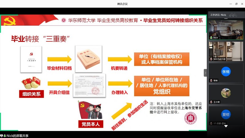 党课结束后,赵菲菲老师为毕业生党员讲解党组织关系的转接流程及注意事项,其中包括毕业转接“三重奏”、毕业生党员转接原则、转接组织关系步骤等等,针对“口袋党员”等一些注意问题进行了严肃的提醒,并希望党员们在今后继续加强党的理论学习,发挥党员的表率作用,把初心落实到实际的行动中去。