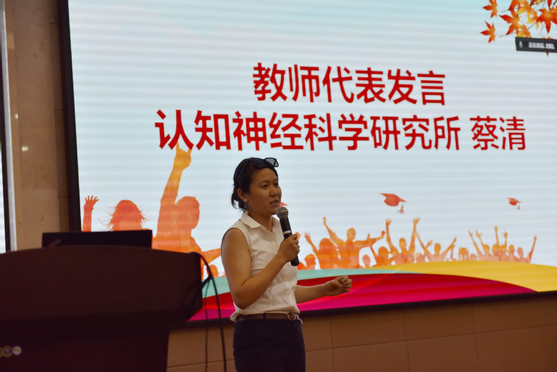 认知神经科学研究所副所长蔡清作为教师代表发言。蔡老师围绕“真爱”和“靠谱”两个关键词,对同学们提出了真挚的期望。“真爱”是对生活、对学习、对研究的热爱。这份爱可以支撑大家在研究道路上收获快乐和幸福。而“靠谱”指的是在与老师、同学的交流中积极反馈,做好沟通,让自己成为一名值得信任的人。