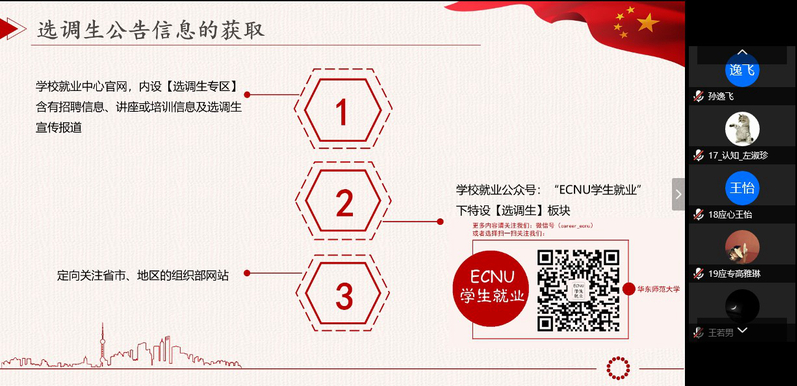 328日,永利yl23411通过腾讯会议在线举办了“选调生政策解读与经验分享沙龙”。本次分享会邀请了公司员工职业发展中心市场信息部主管段言老师和2018MAP吴莹同学(已入选浙江省选调生)作为嘉宾,为同学们解读选调生政策,分享基层就业经验,七十余名同学参与本次活动。