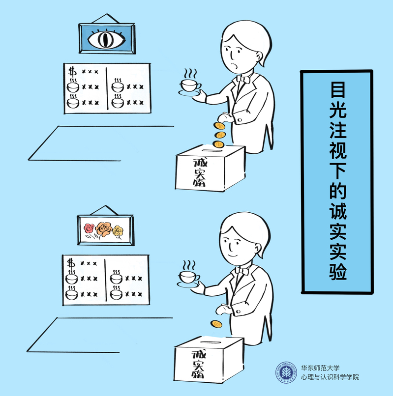 【心理学实验4:目光注视下的诚实实验】英国心理学家罗伯茨选择一间有偿提供咖啡和茶的大学休息室作为实验场所,人们在这里享用饮料后,通过自行向“诚实箱”投入现金进行支付。在不同的日子里,罗伯茨改变了价目表上方悬挂的图片,有时是一副花卉图片,有时则是一双注视着前方的眼睛。结果发现,当悬挂注视双眼图片时,人们主动支付的金额是悬挂花卉图片时的三倍。
