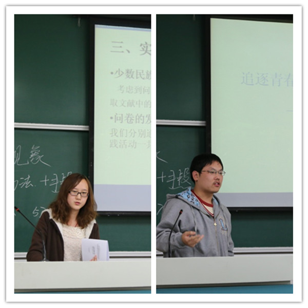 紧接着,在同学们的热切期待中,优秀实践项目的展示环节拉开了帷幕。薛寅申“青年社会组织成长探索”的介绍极富逻辑性、黄祎青“心灵护航志愿者活动”的介绍充盈着满满的爱心、吴家兴“雅安地震灾区灾后心理援助与心理干预初探项目”的介绍既带给大家震撼又夹杂着些许幽默 ,还有王启斐“青海少数民族心理认同”的介绍展现了大美青海之充满着的民族特色,刘楠楠“师道寻梦——全国中小学心理教育现状调研”的介绍体现着一名师范生的责任和严谨,陈洁“心理学职业生涯发展”的介绍则表现出一名心理学员工对于职业发展的思考。介绍期间,陶洁老师穿插点评了对每个项目的看法和意见,并告诉了我们实践活动最质朴的意义——用一双充满发现的眼睛去体验生活,然后讲诉一个“让自己感到自豪”的故事。
