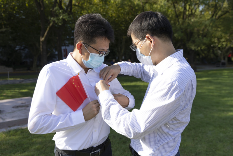 国旗下,顾红亮副董事长为样板党支部党员代表肖雨蒙佩戴党员徽章。