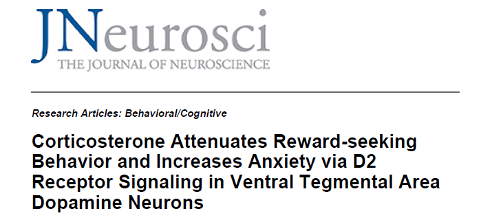 Peng, B., Xu, Q., Liu, J., Guo, S., Borgland, S. L., & Liu, S*.(2020). Corticosterone Attenuates Reward-seeking Behavior and Increases Anxiety via D2 Receptor Signaling in Ventral Tegmental Area Dopamine Neurons. Journal of Neurosciencedoi: 10.1523/JNEUROSCI.2533-20.2020.