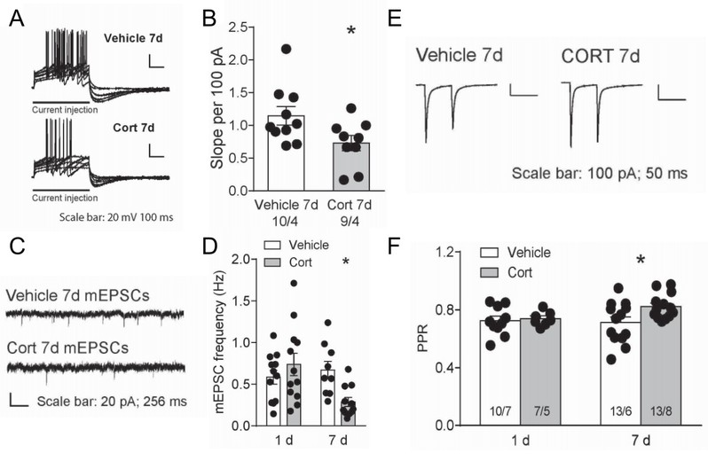 中脑腹侧被盖区多巴胺能神经元在奖赏搜索行为及情绪障碍(包括焦虑样行为)中扮演重要角色。长期皮质酮组动物的行为异常,是否与这些多巴胺能神经元的活动改变有关?通过对这类神经元进行离体全细胞电生理的记录,发现在长期皮质酮组动物中,多巴胺能神经元兴奋性显著降低——在一定的时间内,相同的刺激会诱导出更少的动作电位。除此之外,通过两种电生理方法的测量,发现兴奋性输入的信号传递也发生了下降的现象(图3)。