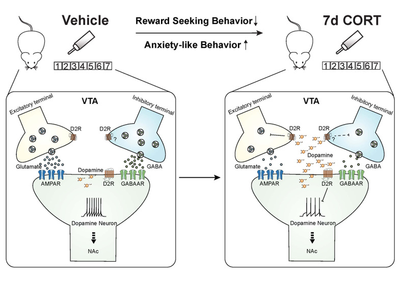 那么为什么中脑腹侧被盖区多巴胺能神经元的活动会在长期皮质酮组动物上发生变化呢?研究通过测试神经元表面兴奋性递质受体电生理功能和内源性大麻素水平,排除了这两种可能因素。经过对前人文献的分析发现,腹侧被盖区多巴胺能神经元的胞体及其兴奋性输入的轴突末梢均存在多巴胺二型受体,多巴胺二型受体受到胞体周围释放的多巴胺激活从而产生自抑制,这极有可能是皮质酮组动物多巴胺神经元的兴奋性及兴奋性输入信号降低的原因。