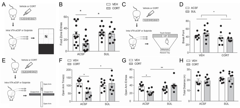 在阐明了长期皮质酮对腹侧被盖区多巴胺能神经元作用机制的情况下,我们是否可以利用该机制阻断皮质酮组动物异常升高的多巴胺神经元自抑制来恢复其行为呢?研究将舒必利微量注射入动物的腹侧被盖区,行为学结果表明其确实能够有效改善长期皮质酮组动物的奖赏搜索行为及焦虑样行为。在使用行为学操作箱测试基于努力的动机行为研究中,微量注射舒必利至腹侧被盖区未能改变皮质酮组动物下降的动机水平,说明可能还有其他神经机制参与皮质酮介导的动机调控。研究同时也表明该药理学操作并不会影响其运动能力。这些结果提示了腹侧被盖区的多巴胺二型受体可以作为一个治疗皮质激素导致认知功能异常的潜在靶点(图5)。