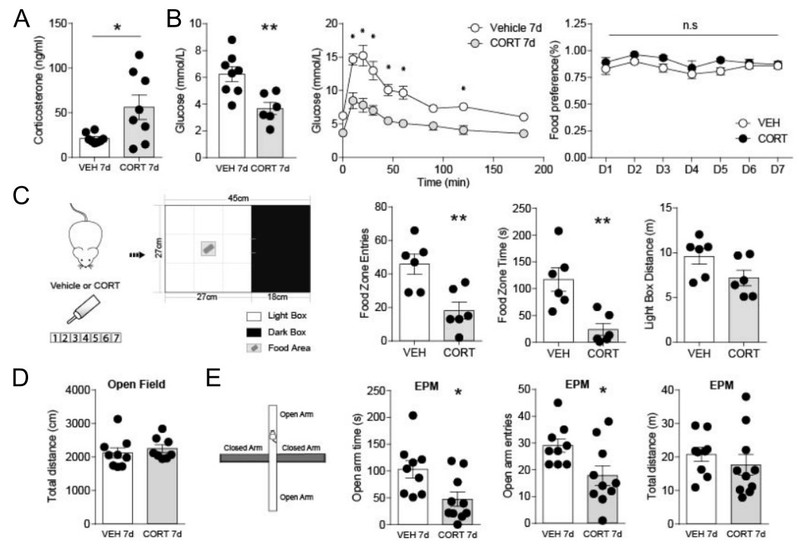 研究首先使用奖赏搜索任务范式和焦虑样行为测试范式,测试了行为表型的变化(图2)。在奖赏搜索任务中,皮质酮组动物会减少到明亮环境的食物区中去搜索高脂高糖食物的行为。在焦虑样行为测试中(十字高架迷宫),皮质酮组动物呈现出开放臂进入次数和时间的显著减少,体现出焦虑样的行为表型。研究也通过总运动距离的测量,排除了运动能力缺陷导致行为变化的因素。以上测试发现,长期皮质酮组动物会表现出升高的焦虑样行为和下降的奖赏搜索行为。