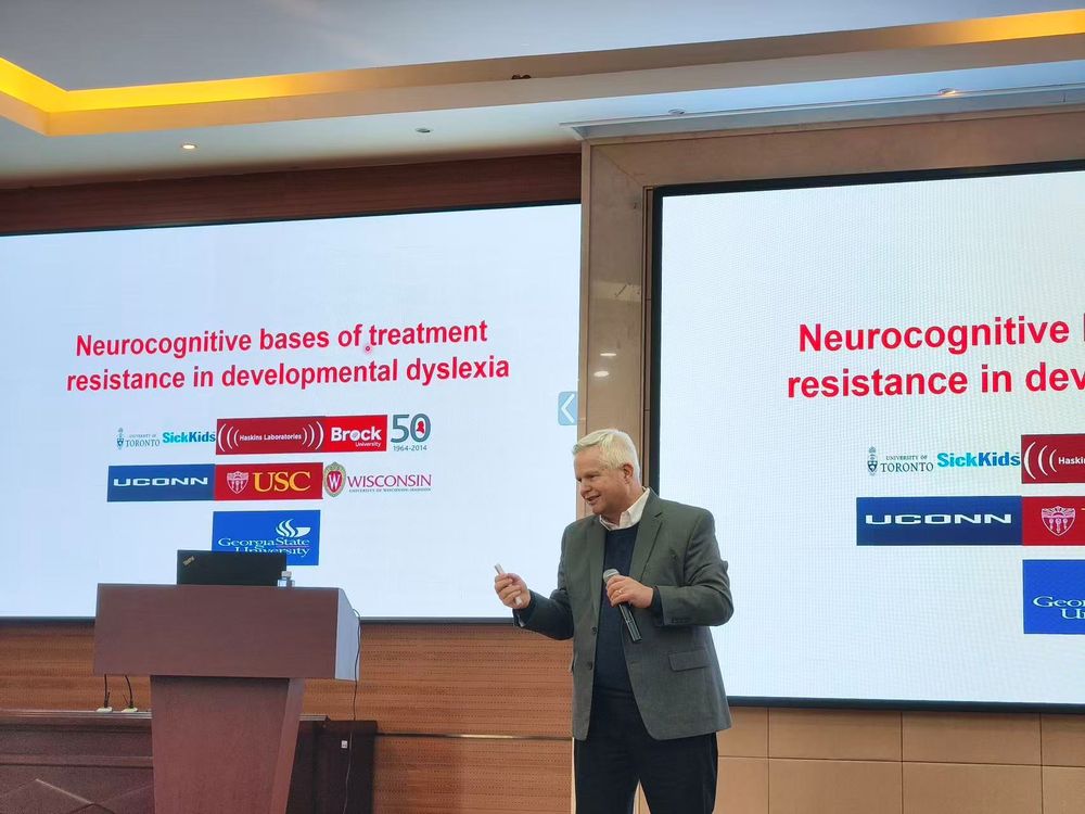 在阅读能力发展的阐述中,Pugh教授强调了语音因素作为底层架构的重要性。通过对比普通话、法语、英语和希伯来语等多国的跨语言研究发现,尽管不同语言的表层形式迥异,但大脑在阅读时对语音加工的依赖具有高度的一致性。基于此,Pugh教授指出语音加工能力的不足正是阅读障碍最核心的生物学特征。此外,讲座还深入探讨了基因、神经生物因素与环境如何共同塑造个体的语言发展与阅读能力。