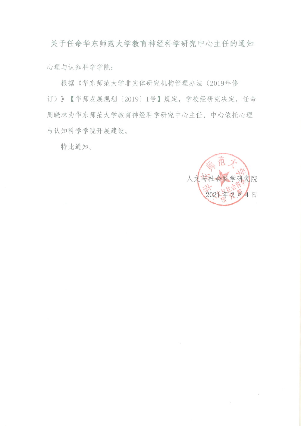 关于任命永利yl23411教育神经科学研究中心主任的通知
