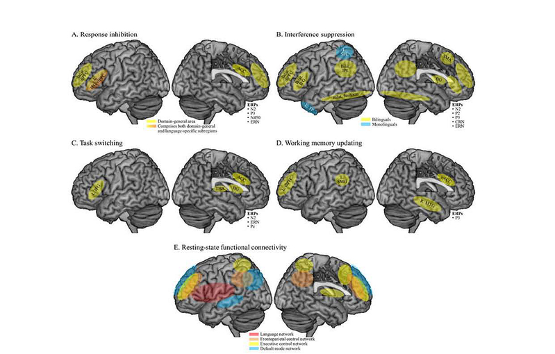 图3.双语经历对脑功能的影响概况(双语者与单语者之间有差异的区域或网络)。A-D.任务相关的脑功能(A.反应抑制,B.干扰抑制,C.任务切换,D.工作记忆更新)。E.静息态功能连接。