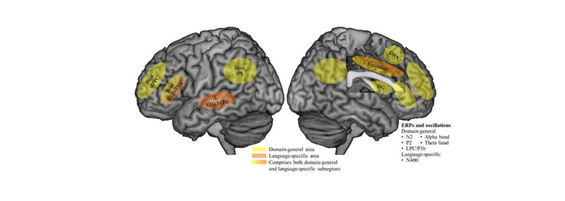 图2.双语语言的神经基础概况。黄色标示领域一般性脑区,橙色标示语言特异性脑区。