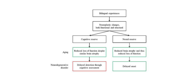 与双语经历相关的功能性及结构性神经可塑性,可能会对认知储备及神经储备有贡献,特别是减缓认知或神经衰退。例如,在具有更严重的神经衰退情况下,双语者仍可能表现出与单语者相似的认知能力水平。然而,认知衰退的减缓可能导致神经衰退疾病的诊断发现,从而导致实施干预措施的推迟。