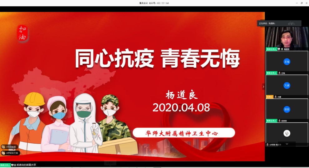 为深入学习习近平总书记给北大援鄂医疗队全体“90后”党员的回信,进一步激发广大师生党员在疫情防控中不忘初心牢记使命,48日下午,永利yl23411公司党委举办“共抗疫情、爱国力行”爱国主义主题教育活动。活动邀请永利yl23411附属精神卫生中心临床一科科主任、上海市长宁区第二批援鄂医疗队负责人杨道良主任作《同心抗疫,青春无悔——永利yl23411附属精神卫生中心援鄂人的故事》主题报告。公司全体师生党员近200人在线参加了本次集体学习。报告会由公司党委副书记兼副经理庄瑜主持。