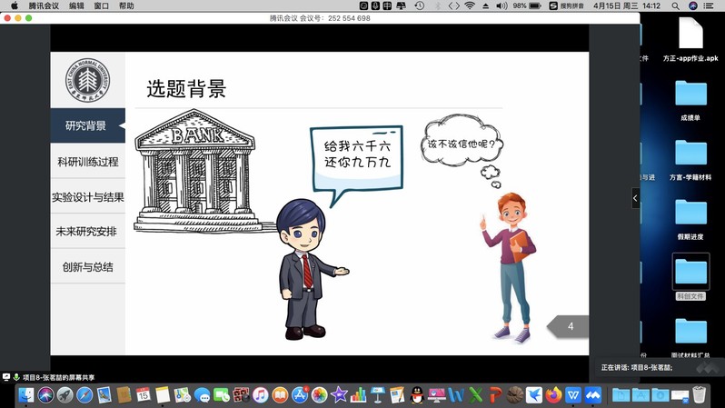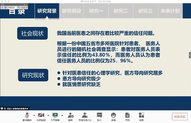参加本次答辩的创新项目涉及到当下心理学重要的多个研究领域参加本次答辩的创新项目涉及心理学研究的多个领域。应用心理学的研究主题包括信任、决策、合作行为、道德规范、抑郁症状和焦虑症状等;发展与教育心理学的研究主题包括儿童心理理论和儿童反应差异等。认知神经方向的研究主题包括表征手势、视觉工作记忆、阅读理解任务、语义网络和认知控制、自发性知觉经络反应、疼痛、抓握控制等。各个项目组重点汇报了项目相关的、科学问题、研究设计、研究结果、面临问题以及下一步的工作计划等。评审专家就每个项目的实施细节和存在的问题进行了针对性的交流,为项目的顺利执行和质量提升提供了必要的指导。