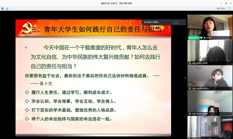 开班仪式上,永利yl23411关心下一代工作委员会主任杜公卓教授通过音频为大家讲述并解析了习近平给北京大学援鄂医疗队全体“90后”党员的回信内容以及背后的故事。面对疫情的挑战,“90后”党员们的行动展示了党员的责任与担当,习近平总书记在回信中肯定并赞扬了青年党员同志们的青春力量与风采,并寄予了希望。杜公卓教授希望同学们能够谨记习近平总书记的教导,勇挑社会责任和使命,为国家和社会贡献青春力量。