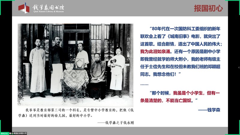 傅强老师在讲座中,引用了很多钱学森的自述,从他的自述中,可以深切感受到一位胸怀祖国、心系人民的伟大人民科学家的初心。在美学习期间,钱学森的报国初心驱使他不懈努力,成为了世界级的大科学家。然而他始终心系国家,最终决定放弃在美国的优越条件返回建设自己的国家。钱学森离美回国时谈到:“今后我将竭尽努力,和中国人民一道建设自己的国家,使我的同胞能过上有尊严的幸福生活。”克服种种困难回国后,钱学森一心向党,渴望成为一名共产党员,他认为:“一个对自己有着更高的要求的人,愿为党的事业做出更大更好的贡献的人,他就会很自然地产生一种靠拢党、努力使自己成为一个共产党员的崇高愿望。”于是,钱学森认真准备并递交了入党申请书,虚心接受群众提出的意见,最终成为一名中共党员。