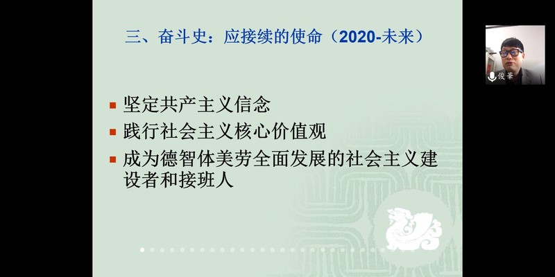 2020年到未来的奋斗史阶段是我们“应接续的使命”。张俊华老师向同学们提出三点要求:一是坚定共产主义信仰;二是践行社会主义核心价值观;三是成为德智体美劳全面发展的社会主义建设者和接班人。共产党员应当起到先锋模范作用,积极入党的同学们也应当严于律己、以身作则,即便是疫情在家期间也要对自己有严格的要求,坚定信仰并为之奋斗。