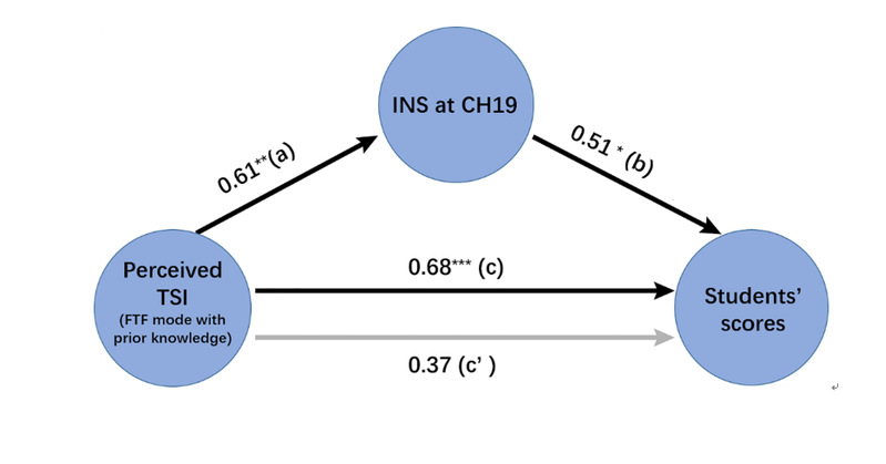 A)有先验知识的FTF教学情境下的INS;(B)不同教学情境下左侧前额叶(通道19INS的差异;C)两种教学情境中左侧前额叶皮层的INS与感知到师生互动的相关性;(D)两种教学情境下左侧前额叶皮层的INS与员工成绩的相关性。