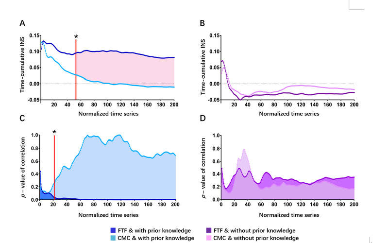 A&B)有/无先验知识的教学情境下,FTFCMC教学模式的INS差异的动态变化;(C&D)有/无先验知识的教学情境下,FTFCMC教学模式的INS对教学成绩的预测。