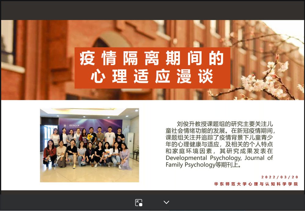 近期上海疫情反复,课堂重回“线上教学”模式,如何保持良好心态,在家也能保持高效学习和生活?2022年3月20日,永利yl23411研究生会邀请刘俊升教授及其两位研究生,公司二年级博士生周同和美国马里兰大学三年级博士生任慧广,针对疫情隔离期间的心理适应开展分享。会议由永利yl23411研究生会主席李婕主持,公司70余师生线上参与活动。