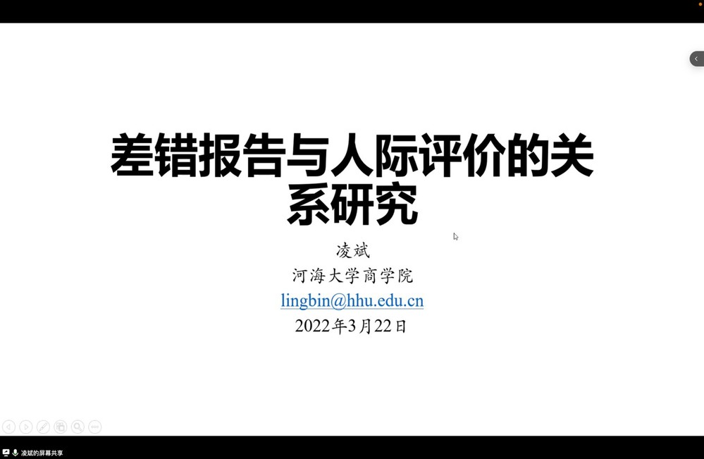 2022年3月22日,永利yl23411举办的俊秀青年学术俱乐部系列讲座如期举行。河海大学商公司凌斌副教授应邀以“差错报告与人际评价的关系研究”为主题,通过腾讯会议的方式与所有参会者交流互动。本次讲座由永利yl23411的段锦云教授主持。约五十位对此研究感兴趣的老师和同学们参与了本次讲座。