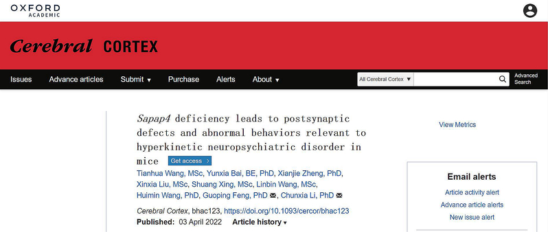 202243日,永利yl23411李春霞副研究员及其合作者团队在国际权威期刊Cerebral CortexSCI,5-Year IF: 6.32)在线发表了题为“Sapap4 deficiency leads to postsynaptic defects and abnormal behaviors relevant to hyperkinetic neuropsychiatric disorder in mice”的研究论文。该论文提供了SAPAP4在突触中发挥重要作用的证据,发现了SAPAP4功能障碍与躁狂症等多动性精神障碍间的潜在关联,为理解多动性精神疾病的病理机制提供了新思路。
