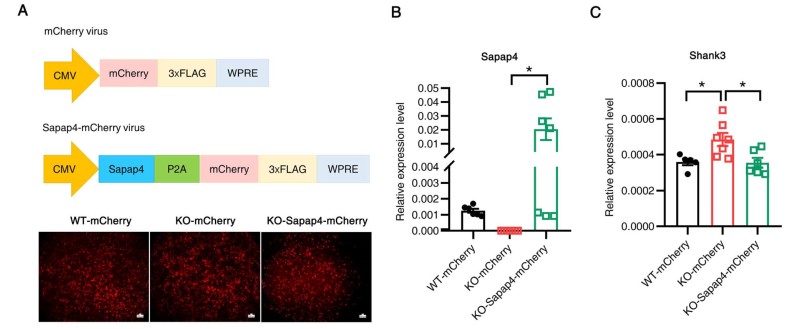Shank3基因的缺失(自闭症谱系障碍的单基因致病原因)和重复(与注意力缺陷多动障碍相关)都会导致神经发育障碍,这表明Shank3基因具有较强的剂量效应。该研究在SAPAP4基因缺失动物中发现SHANK3蛋白表达增加,结合先前关于SHANKSAPAP相互作用的证据,那么SAPAP4是否调控Shank3的表达?研究发现,恢复Sapap4基因缺失动物中的Sapap4表达可使由于Sapap4基因缺失导致的Shank3 mRNA升高的表达恢复正常(图3),因此,Sapap4可能在Shank3转录调控中发挥重要作用。