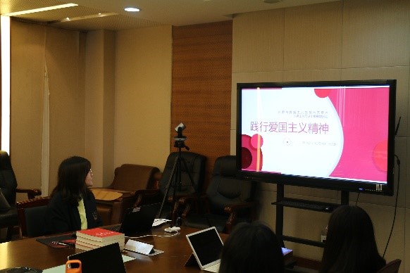 会上,侯莹莹、张弘弛、钟佳艺等7位同学基于家乡的红色教育基地和革命先烈的红色事迹,分享了爱国主义精神在家乡的传承。侯莹莹从家乡六安的革命历史中感悟爱国精神,她提到“坚贞忠诚,牺牲奉献,万众一心,永跟党走”的六安大别山精神和革命先烈的英雄事迹是六安人一直学习和缅怀的宝贵财富。张弘弛作为一名少数民族同学,讲述了在内蒙古大青山抗日游击根据地蒙汉人民团结一心、共同抗日的英勇事迹,她表示各民族同命运,只有团结一心,一致对外,才能走向中华民族的伟大复兴。钟佳艺介绍了家乡湖北省红安县黄麻起义纪念馆中的红色故事,她表示 “万众一心,为党为民,朴诚勇毅,不胜不休”的红安精神是红安革命前辈的一生写照,是红安人民的生动体现,同学们应该牢记党全心全意为人民服务的宗旨,牢固树立共产主义理想信念。