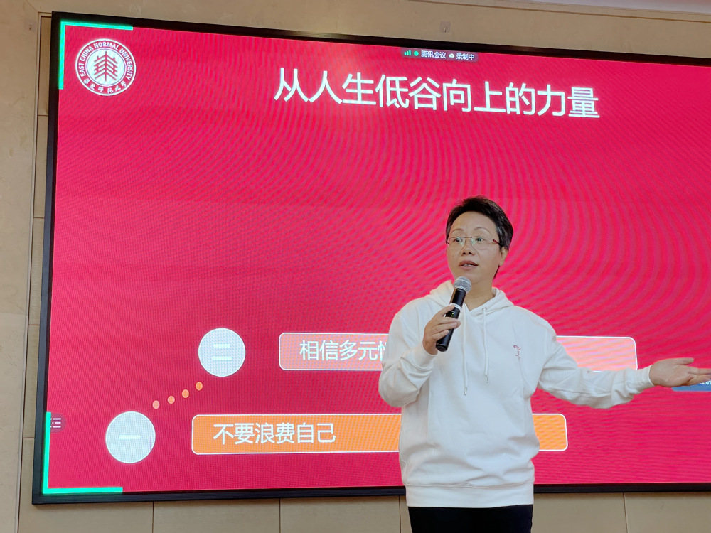 张炯分享了人生中的多个低谷时刻,以及在她直面困难时,对生活态度的思考与转变的过程。她提出人生低谷向上的力量,鼓励同学们在低谷时刻不要浪费自己的青春,相信事物的多元性、可能性,极致思考,学会珍惜与放下,珍爱生命和生活。