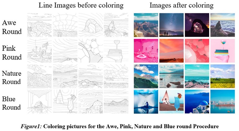传统涂色游戏(比如曼陀罗涂色)可以帮助人们摆脱消极的“内心对话”和消极的想法,从而减少心理压力,改善情绪。而网络涂色游戏近年来受到许多人的青睐,比如Art Coloring - Coloring Book & Color by Number游戏有150万次下载量,全球日活跃用户超过8万。因此,若是网络涂色游戏能够有效提升参与者的心理健康,那么就可以作为一种提升大众心理健康的有效干预手段。根据以往研究,敬畏(awe)、自然(nature)、蓝色(blue)和粉色(pink)对心理健康具有积极作用,能够提升主观幸福感并降低焦虑。因此,本研究基于前人实证结果,根据四种对心理健康有积极作用的涂色特征设计制作涂色干预图片包,并上传Art Coloring – Coloring Book & Color by Number游戏,探讨疫情下线上涂色游戏干预对主观幸福感和焦虑的作用。