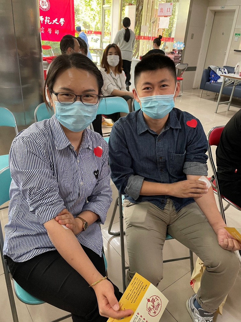 董镕、李琳怡、赵菲菲等老师与大三本科生班委担任爱心志愿者一起布置服务台,为献血同学们提供桂圆红枣茶与巧克力,补充能量。