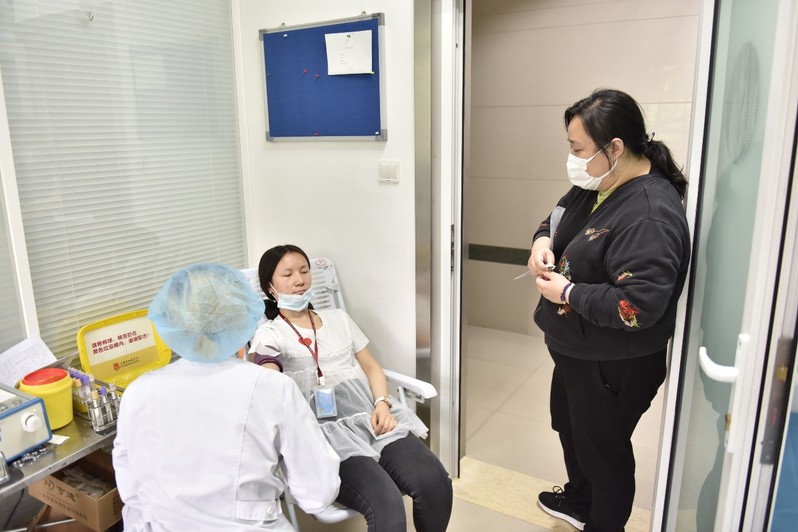 公司党委副书记庄瑜与李琳怡一起慰问献血员工。