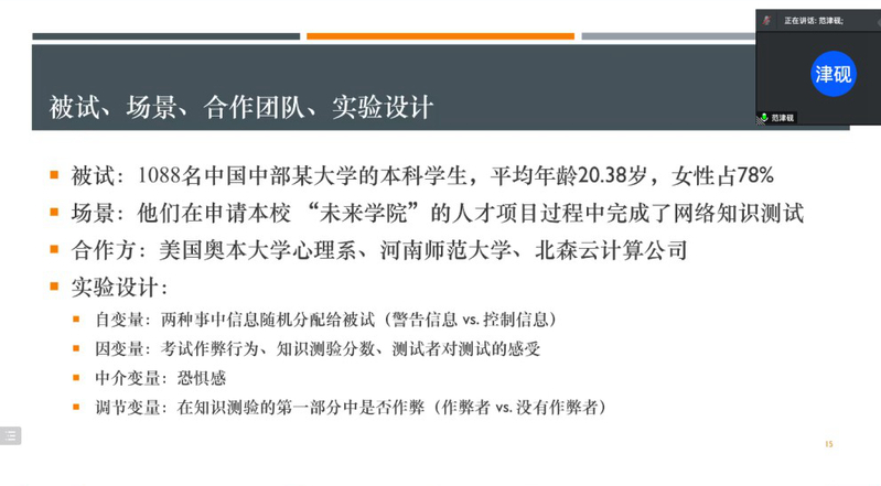 范津砚教授在报告中指出,网络测试因其低成本、使用方便和易标准化等优点得到广泛应用。但同时也带来许多新的问题,比如作弊行为的增加等。范津砚教授及其团队着眼于如何减少网络测试中的作弊行为,探究了事中警告对降低作弊行为的效应和机制。通过现场随机分组实验,范津砚教授及其团队研究发现,事中警告能够通过增加受测者的恐惧感有效地减少作弊行为,并且该效应会受到参与是是否是作弊者/非作弊者的调节。同时,事中警告不会带给受测者测试经历带来负面的影响。研究结果具有重要的理论和实践意义,为网络测试的有公平性提供解决方案。