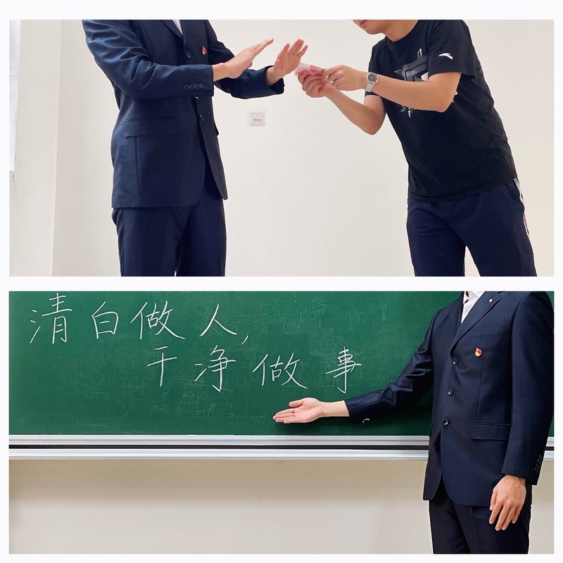 本科生党支部的作品《清白做人,干净做事》借鉴公益宣传作品的拍摄手法,使用“受贿场景”以及直接明了的宣传语的呈现方法,简明扼要地表达了廉洁理念,倡导大众无论在日常生活中,还是在工作岗位上,都要做到廉洁修身,洁身自好。