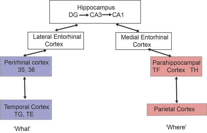 以情景记忆(Episodic Memory)的产生为例,通过动物研究科学家提出了可能负责物体识别(What)和空间位置(Where)的海马体双流模型(Dual-Streams Model,如图1所示)。其中物体识别通路(Ventral Stream)通过腹侧皮层通路,即鼻周皮层外侧内嗅皮层连接海马本体。而空间位置信息则通过背侧通络(Dorsal Stream)传导,即海马旁回和内侧内嗅皮层连接海马本体。最终双流的信号在海马的CA3区中的单一网络神经元汇聚从而形成对发生在哪里的事件产生情景记忆。