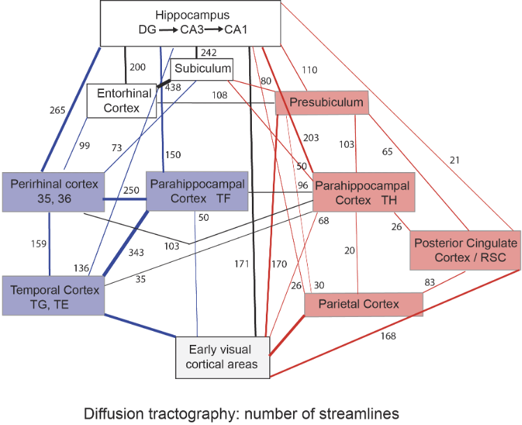 尽管海马体与记忆功能的关系因为大量的相关研究已广为人知,但迄今大多数的知识和假说仍来自于动物研究实验对于人类复杂大脑网络中海马所扮演的角色,目前仍然缺乏研究证据。在猕猴大脑中,科学家发现除了前面提及的双流模型以外,还可能存在海马系统与其他皮层区域间的直接连接,如海马CA1区与颞上沟前部,以及眶额叶和前扣带回均有发现直接的白质通路连接(Zong et al., 2005)。除此之外,CA1神经元也与许多颞叶皮层区域直接相连,包含后海马旁回、鼻周皮层、海马下托以至于颞极皮层的连接(Zong and Rockland 2004; Ichinohe and Rockland 2005)。不仅如此,在啮齿类动物中也能发现CA1到后扣带皮层、下丘脑和丘脑中缝核区的投射连接(Haugland et al., 2019, Cenquizca and Swanson et al., 2006)。这些证据让我们认识到,至少在灵长类动物中,海马区域对大脑皮层的连接可能比经典双流模型的假设要更加复杂而获得有关人类海马系统与其他皮质区域的直接连接证据对于了解人类海马在健康和疾病中的运作方式至关重要。