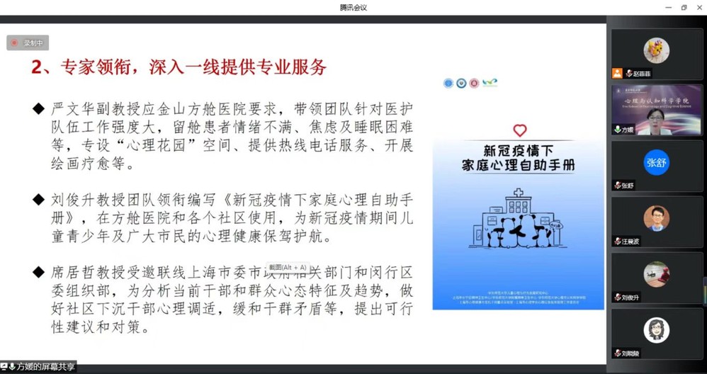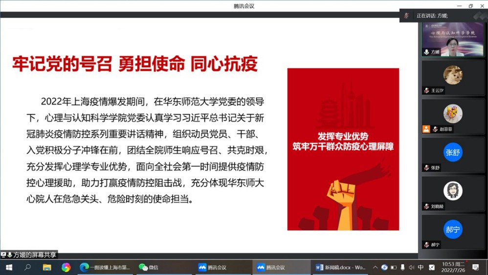 接着,方媛书记联系实际,对2022年上海疫情期间公司的抗疫工作进行了回顾和总结。公司党委认真学习习近平总书记关于新冠肺炎疫情防控系列重要讲话精神,组织动员党员、干部、入党积极分子冲锋在前,团结全院师生响应党的号召、共克时艰,践行使命担当。受教育部委托,公司于4月14日面向全社会开通“教育部永利yl23411心理援助热线平台”,向大众提供疫情相关的心理援助热线和网络支持服务。热线中累计挽救150例心理危机者,解决近500例大中小员工的心理问题,处理1000多例家庭关系问题。智能服务平台的访问总数也达32915人次,切实为疫情中的公众提供了及时的帮助。公司党员教师严文华、刘俊升、席居哲等多位专家领衔,深入一线提供了手册编写、绘画疗愈、对策分析等专业服务。此外,上海市心理健康与危机干预重点实验室领衔推出了3期疫情防控时期心理健康教育网络公益课堂。公司通过直播讲座、微信公众号、Psy Echo电台等多个平台向公众科普疫情防控心理学知识。公司党政领导班子深入一线,带领师生共同守护校园。全院共计75名师生党员服务在抗疫一线,为抗疫做出了切实的贡献。