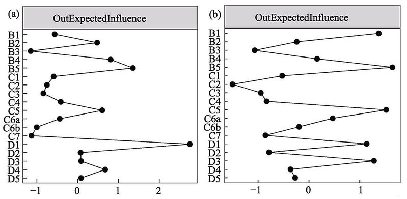 通过交叉滞后网络估计出的灾后T1→T2 (3个月到15个月时)以及灾后T2→T3(15个月到27个月时)的PTSD网络分别如图1(a)和图1(b)所示。中心性估计表明PTSD网络中out-EI高的症状存在时间特异性(见图2)。3-15月的高中心症状是睡眠问题(D1),其次是线索引发生理反应(B5); 15-27月的高中心症状是与他人疏离(C5)和线索引发生理反应(B5)。这表明睡眠问题在PTSD的网络中的作用在不同阶段是变化的。