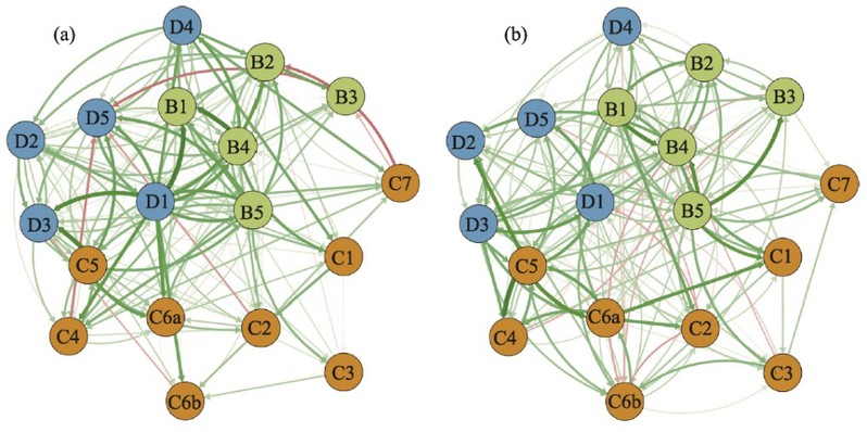 研究团队采用交叉滞后网络估计的方式来构建T1→T2和T2→T3的交叉滞后网络, 以探究灾后两个阶段中PTSD症状网络内症状的预测路径。这是由Rhemtulla等人(2021)开发的使用纵向面板数据推测网络中变量预测方向的方法,控制每个项目的自回归效应并估计上一个时间点的单个项目对下一个时间点时的所有其他项目的预测。在症状网络的图中, 节点代表症状, 箭头代表交叉滞后效应的方向, 绿色箭头表示正向预测, 红色箭头表示负向预测, 线条粗细表示关联的强度。由于交叉滞后网络估计的边缘是有向的, 所以可以得出发出预期影响(out-expected influence; out-EI)和接收预期影响(in-expected influence; in-EI)两种中心性指标。out-EI表示了一个节点在网络中预测其他节点的程度; in-EI表示了一个节点在网络中受其他节点预测的程度。由于out-EI高的症状可以预测大量其他的症状, 即它的激活可能继而引发网络中的其他症状, 因此在临床研究中被特别重视。