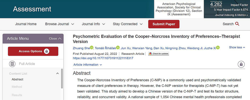 She, Z., Řiháček, T., Xu, J., Yang, W., Xu, D., Zhou, N., Ji, W., & Xi, J. (2022). Psychometric Evaluation of the Cooper–Norcross Inventory of Preferences–Therapist Version. Assessment. doi:10.1177/10731911221118317