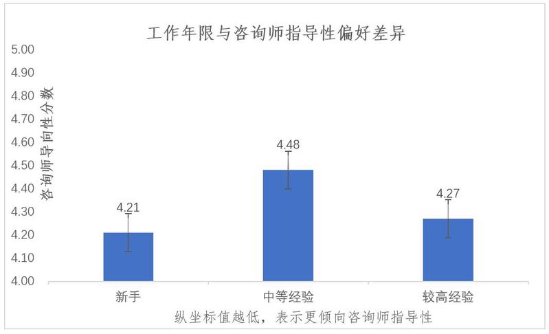 为探讨咨询师工作年限与咨询偏好之间的关系,我们将咨询师分为三类:新手咨询师(<5年),中等经验组(5-10年)和较高经验组(≥10年)。结果发现,与中等经验咨询师比较,新手咨询师与经验丰富的咨询师在咨询中使用更多的指导性(therapist directiveness)。 在咨询师指导性维度,新手咨询师与经验丰富咨询师之间不存在显著差异(p = .48)。