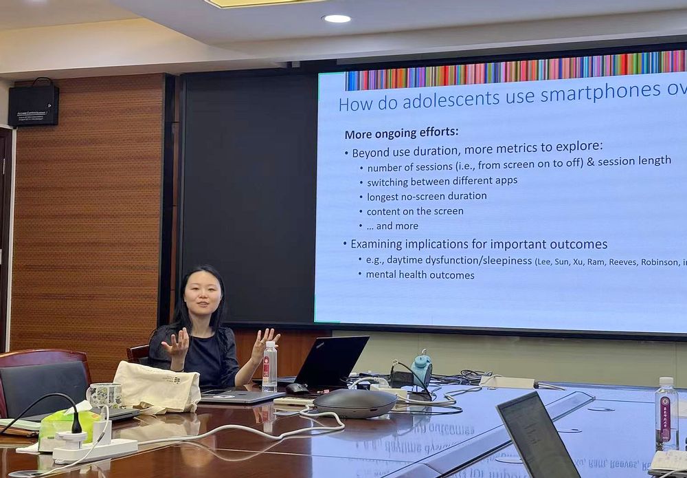 孙潇然博士首先介绍了Screenomics—“人类屏幕组”这一由斯坦福大学团队发起的研究框架,通过示例探讨了采用应用程序密集收集智能手机使用行为,并对其中包含的丰富数据进行提取、编码的过程,以及相关方法的优势和挑战。随后,孙博士基于其团队的研究成果,介绍了客观、被动收集的手机使用数据在多个维度上与主观报告数据的偏差,并从睡眠、学业适应、家庭关系、心理健康四个方面,探讨了智能手机使用行为与相关心理行为特征的关联。在随后的问答环节,孙博士与参与讲座的师生展开了深入交流,讨论了相关方法的伦理视角思考、在中国情境中的技术应用、关于检验心理健康和屏幕使用行为双向影响的未来研究方向等,并探讨了此后在相关领域开展合作的计划。讲座结束后,孙博士与公司师生进行了进一步的讨论交流,并共进晚餐,在轻松愉快的氛围中继续探讨研究合作、基金申请、职业发展等话题。