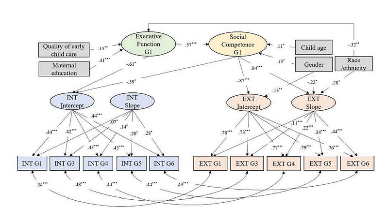 执行功能和社交技能在一年级时进行检测。执行功能的测查采用了持续注意任务(CPT)和韦氏的句子记忆模块。社交技能的检测采用了由父母分别报告的社交技能评估系统(SSRS)、由教师报告的Mock Report Card,和基于教室观察、行为编码的同伴互动。内化和外化问题在儿童一、三、四、五、六年级时分别由教师采用儿童行为核查表(CBCL)进行多次评定。研究还控制了多个变量,包括儿童性别、种族、学前机构教学质量、母亲的受教育水平和家庭经济水平。